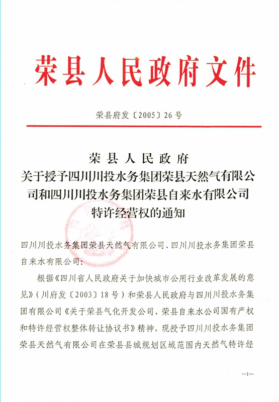 榮縣水司、榮縣氣司特許經(jīng)營權(quán)