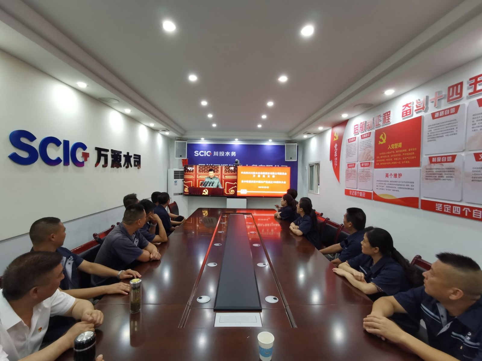 7月1日上午8時,慶祝中國共產(chǎn)黨成立100周年大會在北京天安門廣場隆重舉行。中共中央總書記、國家主席、中央軍委主席習近平發(fā)表重要講話。中共四川川投水務(wù)集團股份有限公司委員會萬源黨支部組織黨員干部共計27人,齊聚黨員活動室,收聽收看了大會直播盛況。