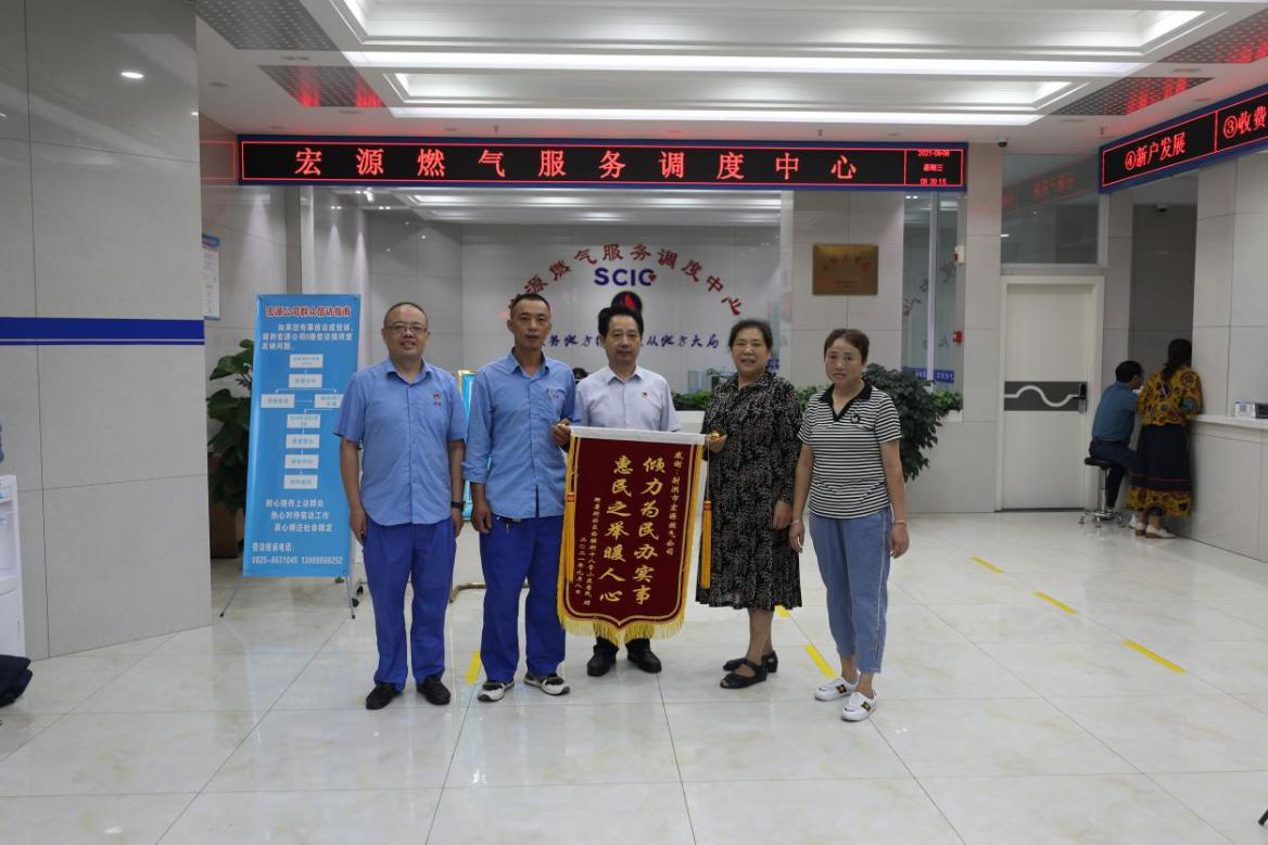 2021年9月8日上午8時(shí),射洪市衙署街社區(qū)西橫街18號(hào)小區(qū)用戶代表將“傾力為民辦實(shí)事 惠民之舉暖人心”的錦旗送到宏源公司負(fù)責(zé)人的手中。