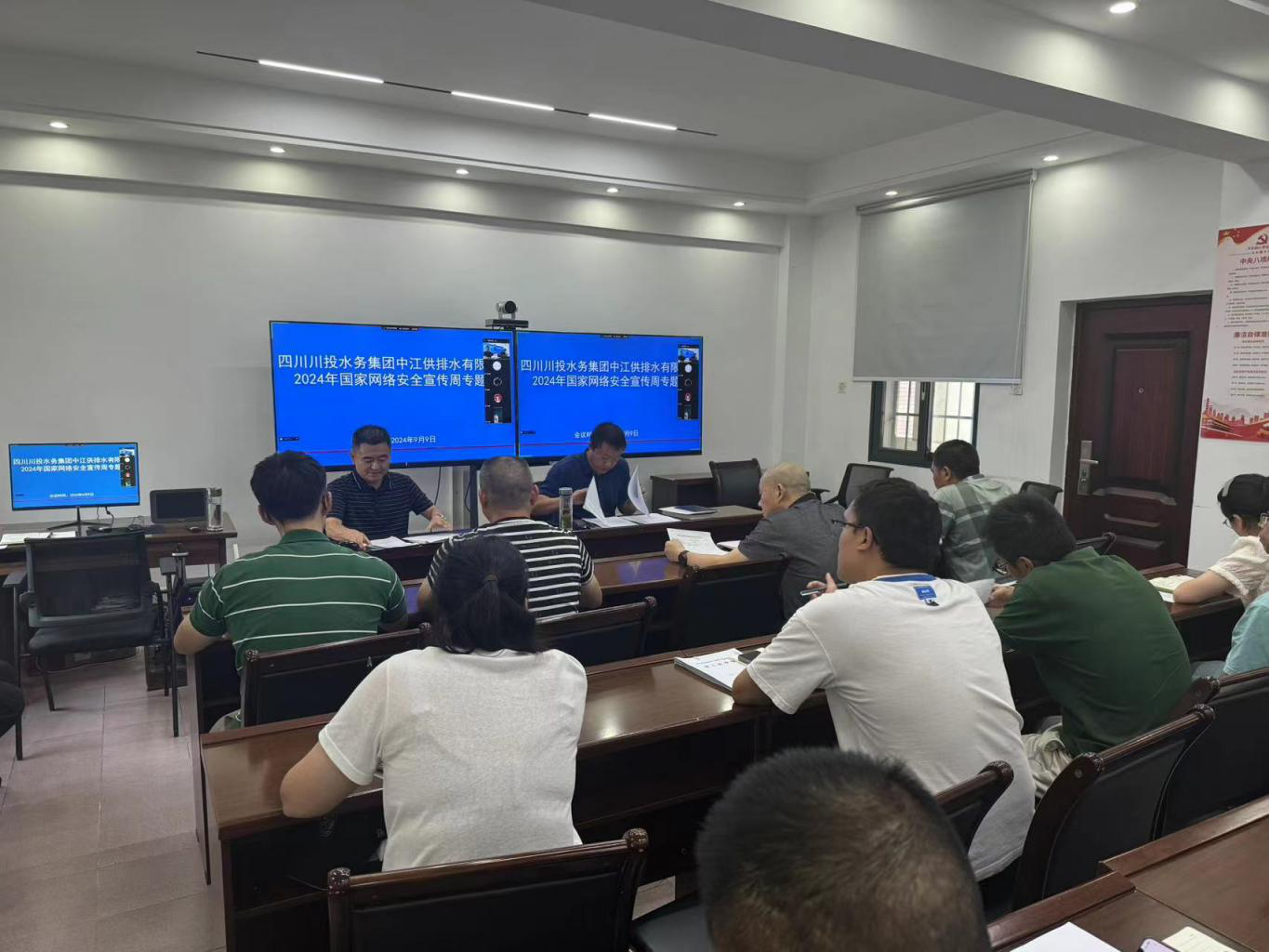 9月9日下午,中江水司黨支部組織公司班組長及以上管理人員,深入學(xué)習(xí)《習(xí)近平總書記關(guān)于網(wǎng)絡(luò)強國的重要思想概論》第一章以及《網(wǎng)絡(luò)安全法》,集中觀看2024年國家網(wǎng)絡(luò)安全宣傳周微視頻,通過公司微信群,轉(zhuǎn)載發(fā)布網(wǎng)絡(luò)安全法律知識、網(wǎng)絡(luò)安全小貼士,并通過各廠LED電子顯示屏,持續(xù)向廣大干部職工宣傳網(wǎng)絡(luò)安全理念,普及網(wǎng)絡(luò)安全知識。