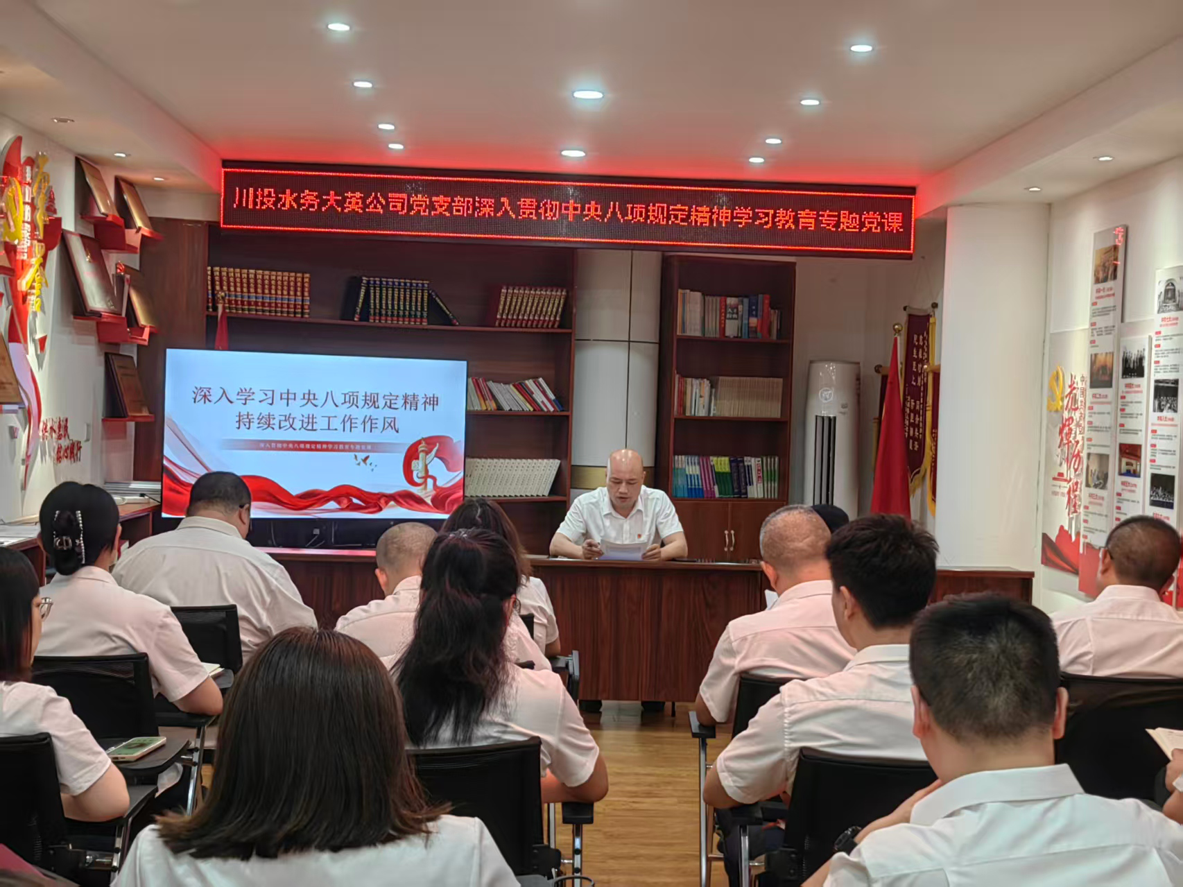為深入貫徹落實中央八項規(guī)定精神,持續(xù)改進工作作風建設,川投水務大英公司黨支部于6月19日在公司黨員活動室開展了“深入貫徹中央八項規(guī)定精神學習教育”專題黨課,全體黨員參加了此次學習。