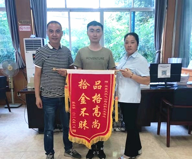 9月10日上午上班伊始,榮縣天然氣公司就收到張女士送來(lái)的一面錦旗,她對(duì)拾金不昧的營(yíng)銷(xiāo)部員工王浩屹表示感謝和贊揚(yáng)。