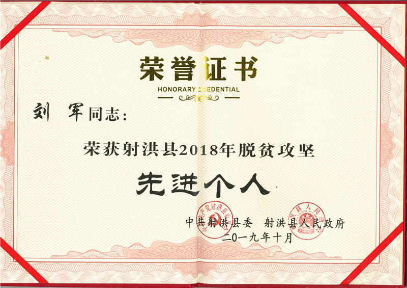 2019年10月15日,在射洪縣文化藝術(shù)中心召開(kāi)的“大愛(ài)扶貧 濟(jì)善射洪—2019年射洪縣脫貧攻堅(jiān)暨社會(huì)扶貧工作推進(jìn)會(huì)”上,宏源公司被中共射洪縣委、射洪縣人民政府表彰為“射洪縣2018年度脫貧攻堅(jiān)先進(jìn)集體”,公司團(tuán)委書(shū)記、大榆鎮(zhèn)飛石溝村駐村工作隊(duì)隊(duì)員劉軍被表彰為“射洪縣2018年度脫貧攻堅(jiān)先進(jìn)個(gè)人”。