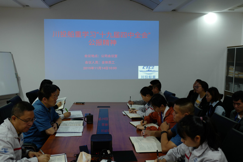 為深入貫徹黨的十九屆四中全會(huì)精神和落實(shí)國(guó)資委對(duì)國(guó)企的要求和部署,川投船重積極響應(yīng),迅速在2019年11月14日上午召開公司大會(huì),組織全體員工學(xué)習(xí)習(xí)近平總書記在黨的十九屆四中全會(huì)中的重要講話及《中共中央關(guān)于堅(jiān)持和完善中國(guó)特色社會(huì)主義制度推進(jìn)國(guó)家治理體系和治理能力現(xiàn)代化若干重大問題的決定》全會(huì)等會(huì)議精神。