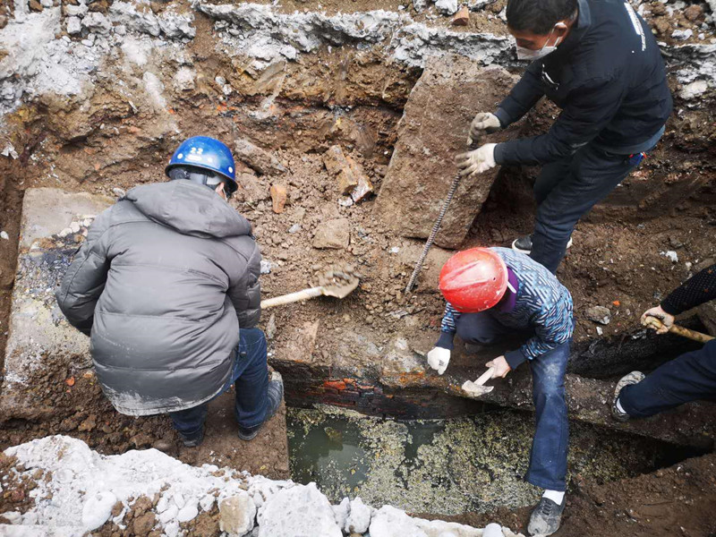 2020年2月18日晨,公司接連接到中江縣城西路用戶反映家中停水,同時繼光水廠值班室也發(fā)現(xiàn)城西片區(qū)壓力比平時略有降低。公司黨支部書記、總經理朱禹接到匯報后立即詢問應急值班維修人員有無應急維修停水搶修點位,當?shù)玫娇隙ǖ拇饛秃?,立即組織相關人員進行分析研判,基本確定城西片區(qū)管網發(fā)生爆管。隨即安排工程搶險隊人員做好個人防護,第一時間兵分兩路對這片區(qū)近一公里的管網進行分段排查。不到一小時,排查人員即發(fā)現(xiàn)城西路金林物資公司外街道下面DN150水泥管爆裂致使該片區(qū)用戶停水。