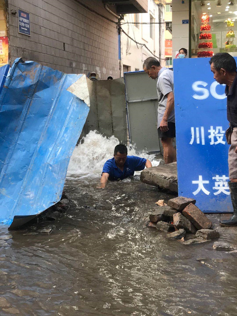 接到報漏后,大英公司第一時間組織搶修隊到達(dá)現(xiàn)場,仔細(xì)查看,為了保證安全,決定立即進(jìn)行打圍處理。同時,搶修員不顧水壓沖擊和水下不明安全隱患,毅然下到水坑,屏住呼吸,沉入水下,探找水閥開關(guān),近30分鐘后,爆管位置水下閘閥關(guān)停,路面積水開始回落。