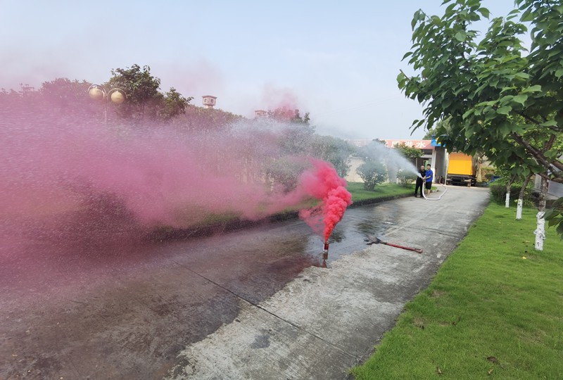 搶險人員分為兩組同時進行搶險,第一組搶險人員穿好耐酸堿防護服,戴好防毒面具,進入加藥車間切斷二氧化氯機電源,打開通風設備和尋找泄漏點;第二組搶險人員為防止二氧化氯氣體大面積擴散,站在上風口利用高壓水槍對泄露的二氧化氯氣體進行稀釋,并準備好干粉滅火器防止設備因線路故障導致自燃。整個演練過程嚴謹、有序,各應急隊伍協(xié)調配合,有條不紊。