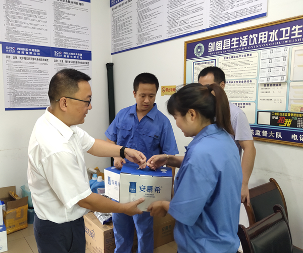 時(shí)值盛夏,連日來劍閣縣暴雨和烈日交替,高溫與高濕度的天氣讓大家仿佛置身于一所天然的“桑拿房”。7月22日,川投水務(wù)劍閣公司黨支部委員、副總經(jīng)理、工會(huì)主席韓名泉率工會(huì)委員朱強(qiáng)、王雪萍一行冒著雨、頂著“桑拿”天氣深入到普安、下寺收費(fèi)大廳和制水廠,為奮戰(zhàn)在一線的職工送去了藿香正氣液、毛巾、洗衣液、牛奶等夏季常備防暑降溫物品,并向他們轉(zhuǎn)達(dá)了公司領(lǐng)導(dǎo)的慰問和關(guān)懷。