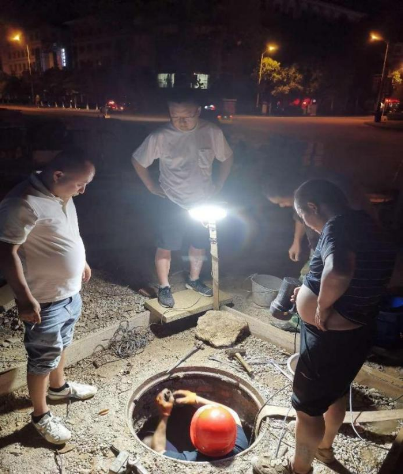 經(jīng)過現(xiàn)場(chǎng)勘察后,工程部部長肖劍率先下井迅速關(guān)閥止水,搶修人員隨即投入到緊張的搶修作業(yè)中。在有限的作業(yè)空間內(nèi),排空積水、管材準(zhǔn)備、管道修復(fù)等各道工序有條不紊地進(jìn)行著,搶修人員搶時(shí)間、搶速度,挑燈夜戰(zhàn),爭(zhēng)分奪秒進(jìn)行搶修。夏日的夜里熱氣騰騰,讓人難以忍受,工作坑里搶修人員克服惡劣天氣,干勁十足,終于在21日凌晨4點(diǎn)完成了管道的搶修工作。緊接著,搶修人員于開始進(jìn)行管道排氣、排水工作,待完成開閥并恢復(fù)供水后,已是清晨5點(diǎn)半了。