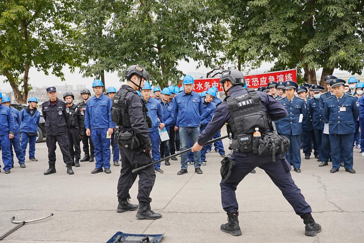 此次演練分為反恐防爆實(shí)戰(zhàn)流程演練和反恐應(yīng)急知識(shí)培訓(xùn)兩個(gè)部分。首先進(jìn)行反恐應(yīng)急實(shí)操演練,設(shè)定為可疑分子試圖強(qiáng)行翻越水廠大門(mén),公司人員報(bào)警、現(xiàn)場(chǎng)處置以及特警大隊(duì)突擊處置、派出所警戒疏散模擬場(chǎng)景。