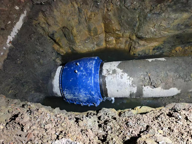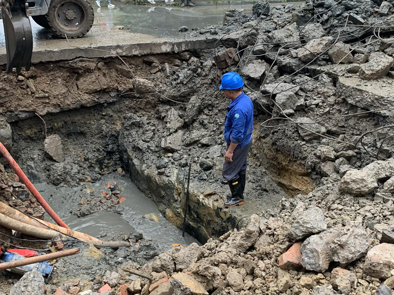 下午2時,公司準(zhǔn)時關(guān)閉總閘,2臺挖掘機同步開展深度挖掘作業(yè)。受管道埋深大、地下土質(zhì)復(fù)雜、作業(yè)面狹窄等因素影響,施工難度遠超預(yù)期。經(jīng)過8小時連續(xù)作業(yè),施工人員才找到DN800mm預(yù)應(yīng)力水泥管,并確認(rèn)爆管主要因為管道大小接頭處膠圈斷裂。