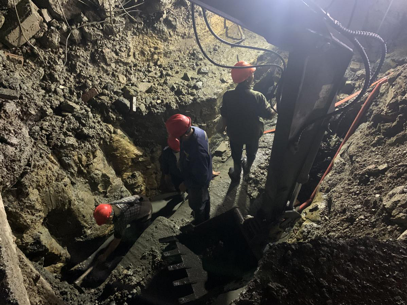 現(xiàn)場立即安排人員前往庫房調(diào)取專用搶修物資——8月定制的DN800球墨鑄鐵搶修節(jié)。又因取水主管底部及周邊被完整巖石包裹,機械開挖無法繼續(xù),作業(yè)方式緊急轉(zhuǎn)為人工開挖,6名作業(yè)人員在狹窄空間內(nèi)佝僂身體,持續(xù)挖掘直至晚上10時30分,終于開辟出合格作業(yè)面。隨后,施工人員用機械將搶修節(jié)運送至作業(yè)點,反復(fù)調(diào)整角度確保與管道精準(zhǔn)匹配,最終在10月22日凌晨2時21分完成全部搶修作業(yè)。